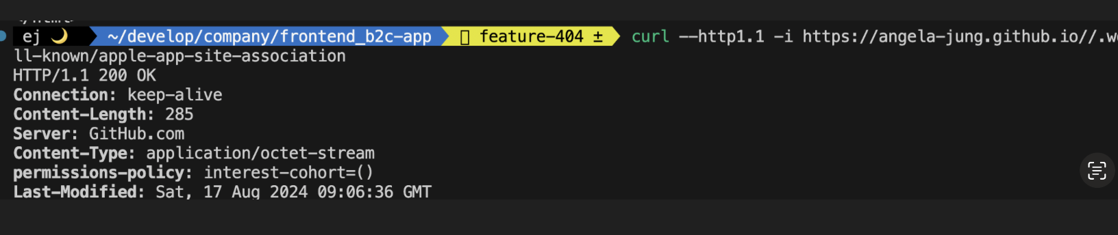 그리고 다시 확인해보면 이제 AASA 파일의 문제는 사라집니다. 명령어를 통해서도 체크가 가능해요! (200ok가 나오면 문제 해결!)