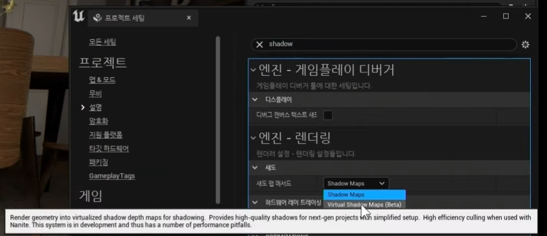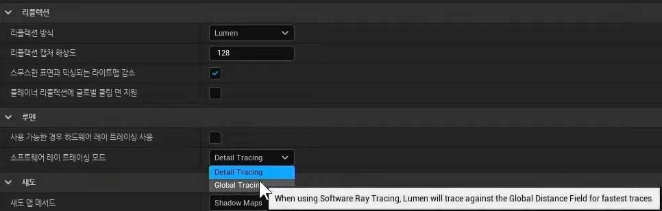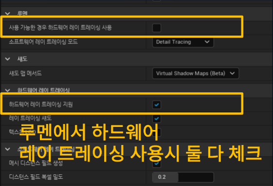 소프트웨어 레이 트레이싱 사용 시 Affect Distance Field Lighting 체크 해제
