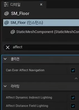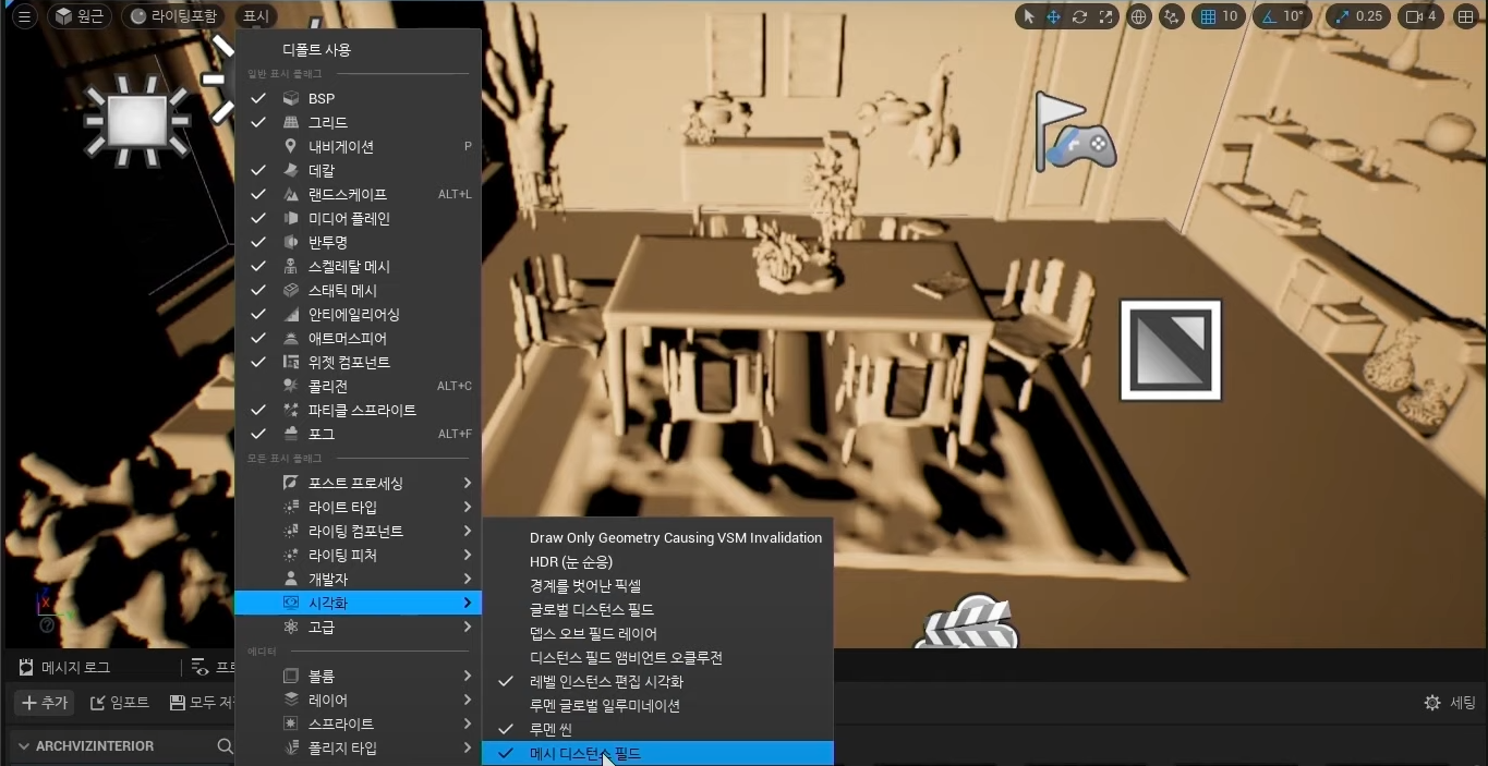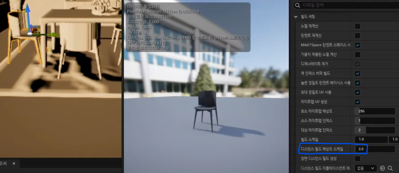 시각화의 메시 디스턴스 필드 뷰로 봤을 때 해상도가 부족한 스태틱 메시는 디스턴스 필드 해상도를 조절하여 높일 수 있음