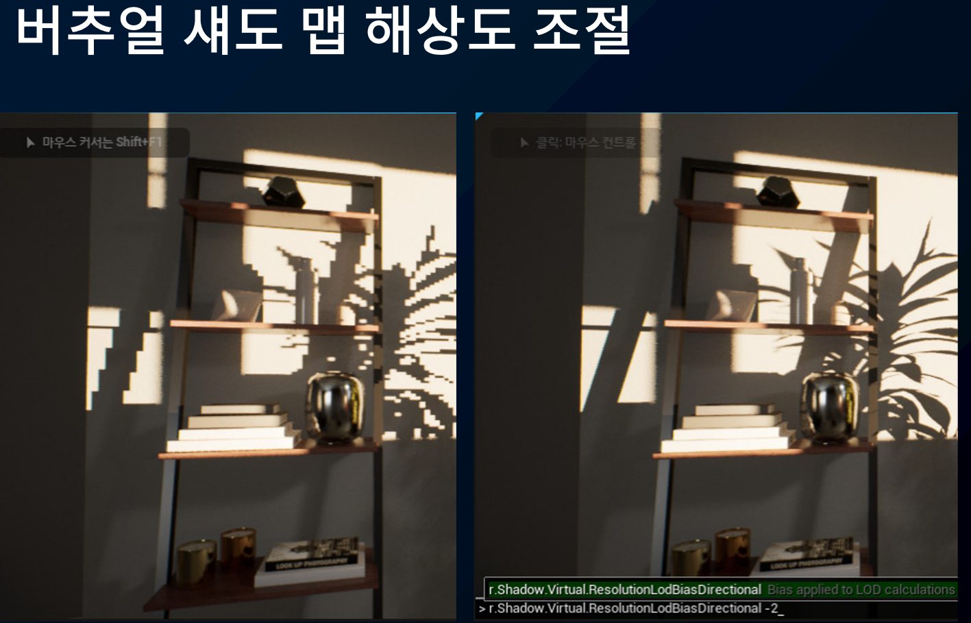 가상화된 텍스처를 사용하여 고해상도의 섀도 맵을 사용 가능하여, 해상도 부족으로 인해 그림자가 깨지는 일 없이 선명하게 표현 가능