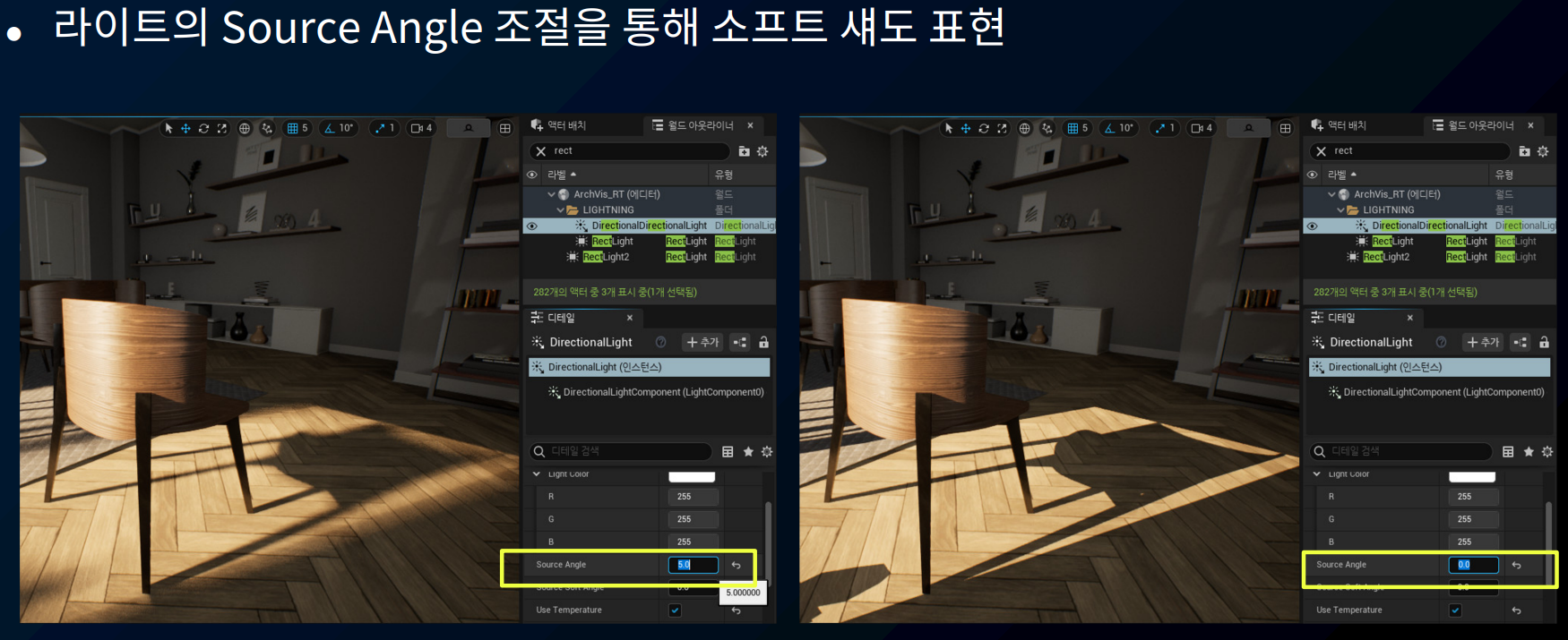간접광으로 인한 간접 섀도우나 색이 물드는 컬러 브리딩 현상도 나타남