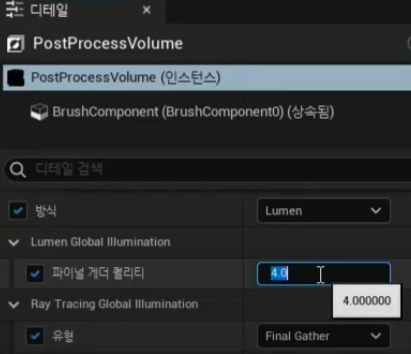 포스트 프로세스 볼륨의 파이널 게더 퀄리티를 조절하여 노이즈 완화 가능