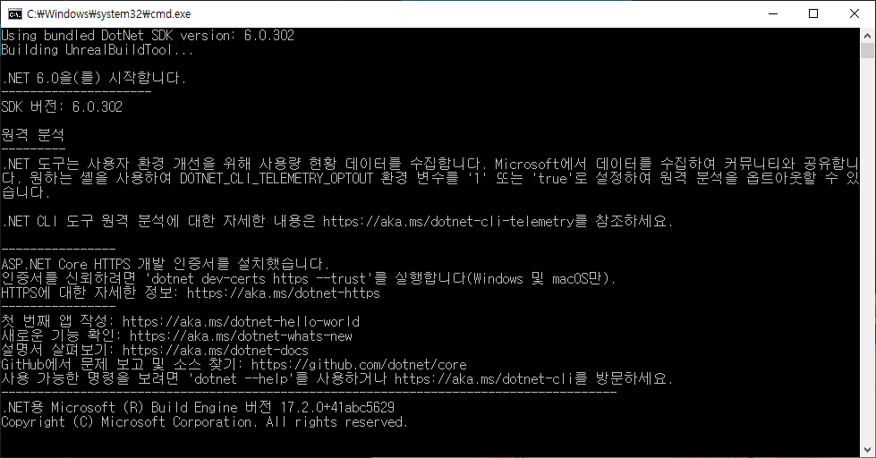 GenerateProjectFiles.bat 배치파일을 실행하면 커맨드 창이 뜨며 빌드를 시작합니다.