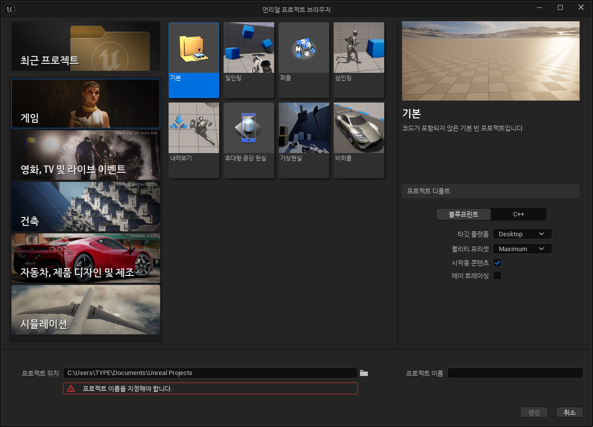 저는 삼인칭 템플릿의 기본 맵인 ThirdPersonMap으로 지정하였습니다.