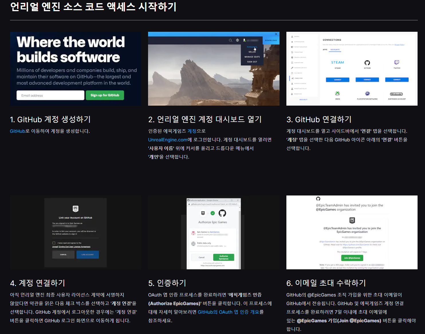 사이트에 들어가면 나오는 순서대로 에픽게임즈 계정에 깃허브를 연동하면 언리얼 엔진 오픈소스에 접근이 가능해집니다.