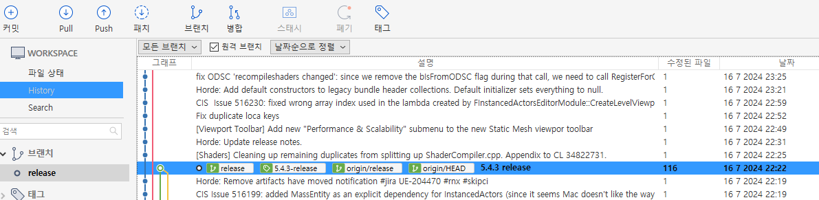 실시간으로 커밋이 반영되는 ue5-main 브랜치도 있는데 만약 release 버전에 적용되지 않은 버전을 쓴다든지 최신 버전이 필요한 경우 사용할 수 있을 것입니다.