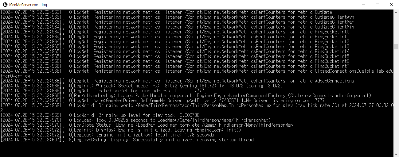로그를 보아하니 서버 기본 맵인 ThirdPersonMap 맵이 정상적으로 로딩된 걸 볼 수 있네요.