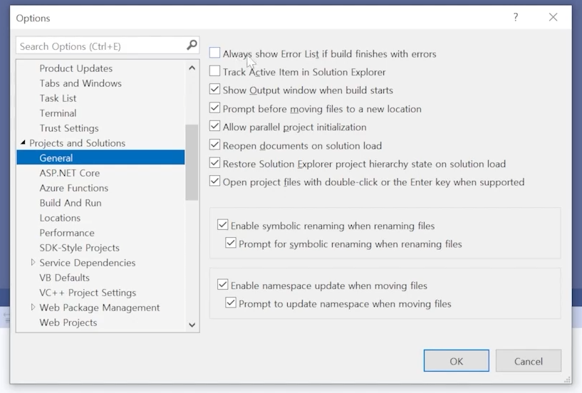 VS 설정에서 'Always show Error List if build finishes with errors' 체크 해제 확인