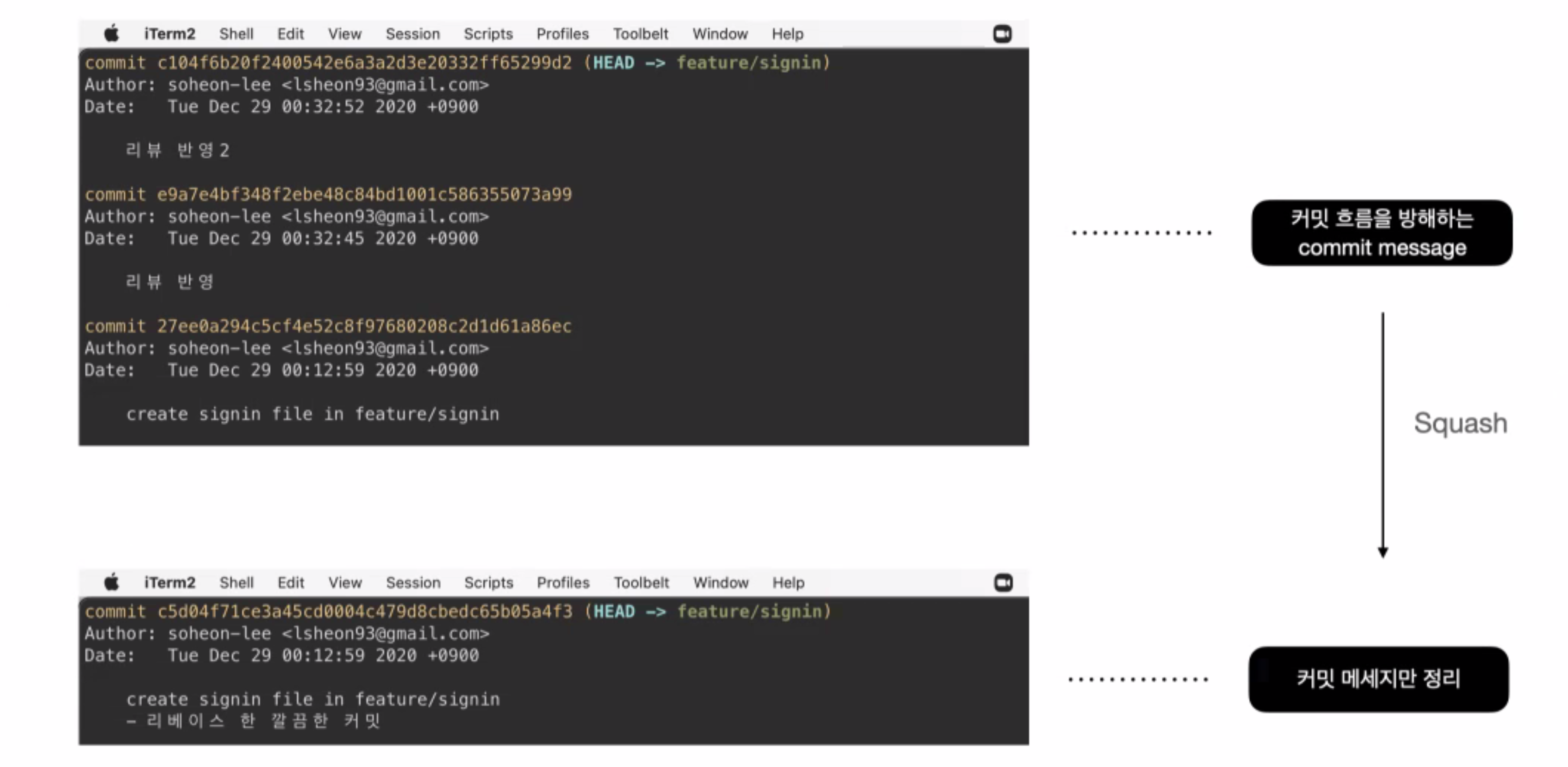 기준이 되는 마지막 커밋의 베이스를 바꿔버린다.