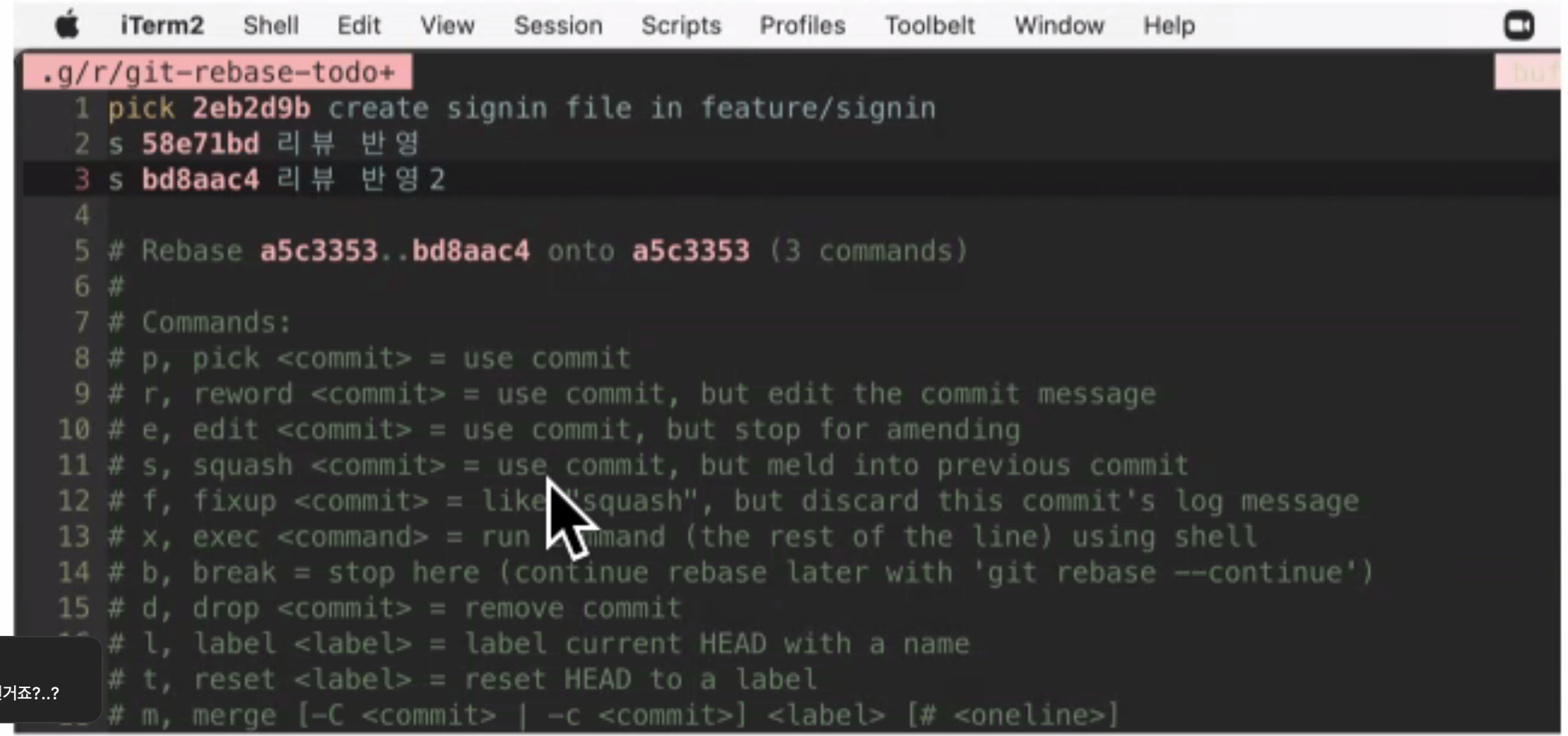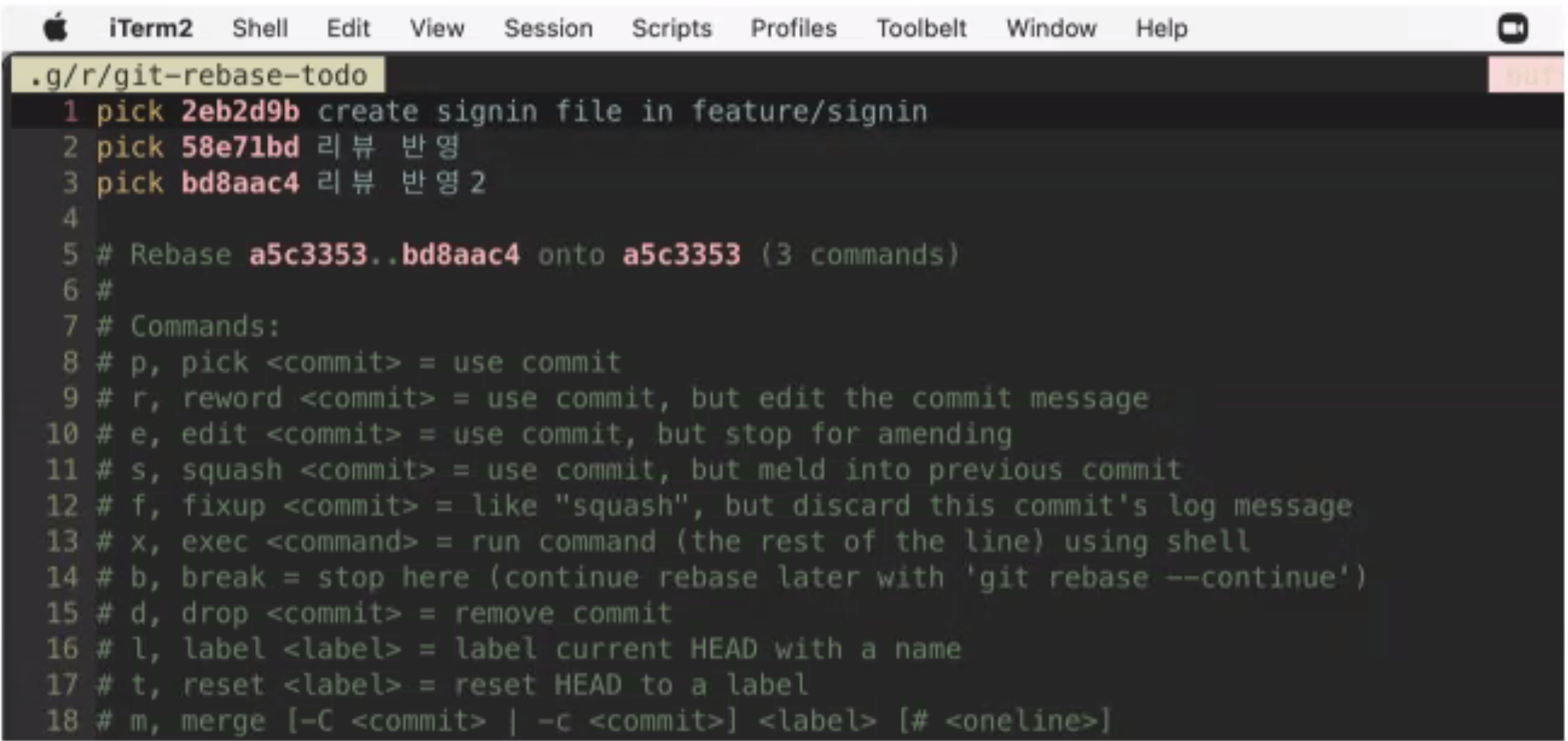 커밋이 순서대로 나오고 pick이 쫙 나온다 (지금까지 커밋내역)