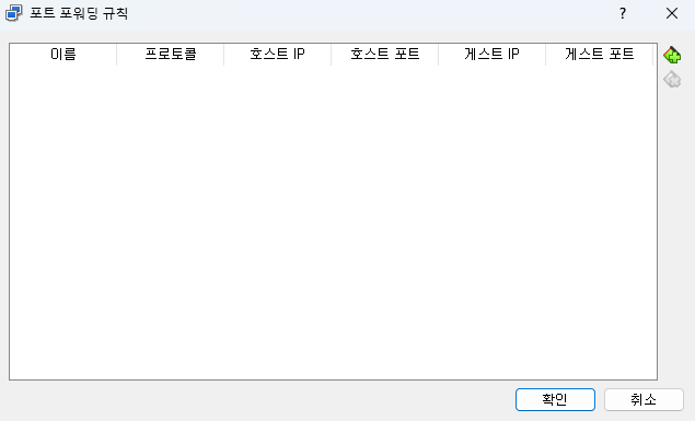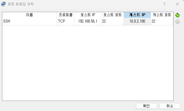 가상머신 설정 > 환경설정 > 네트워크 > 고급 > 포트 포워딩 클릭