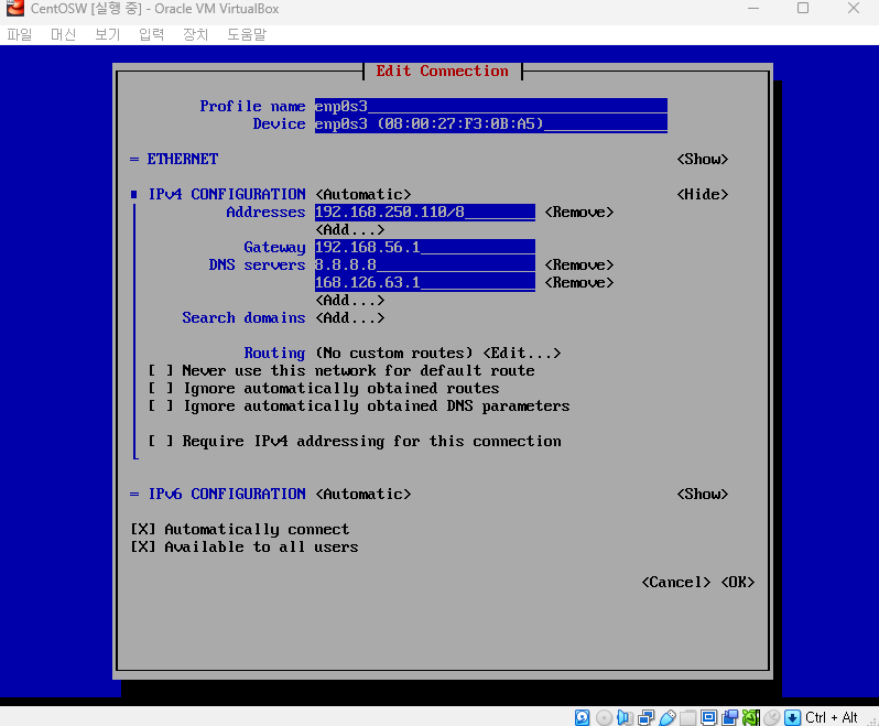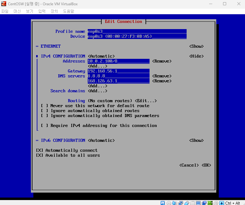 DNS는 8.8.8.8 (구글), 168.126.63.1 (KT) 두가지 입력해준다.