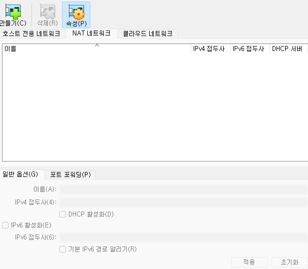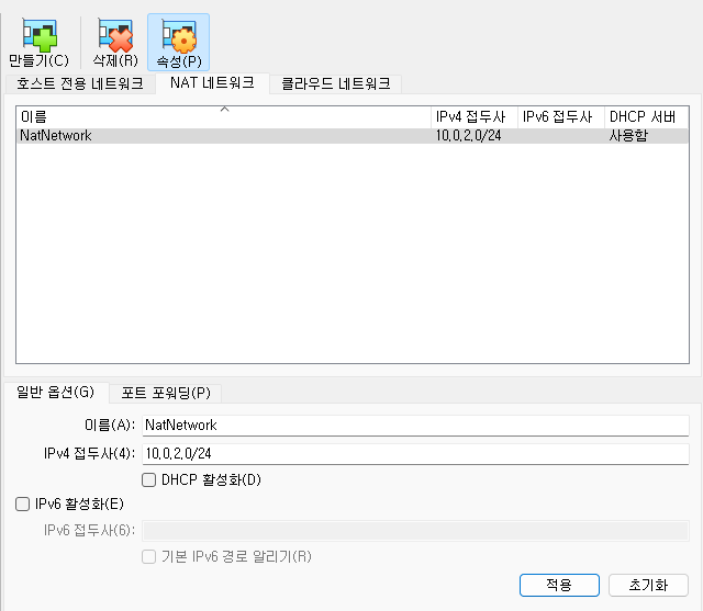 DHCP 활성화 체크 해제 후 적용