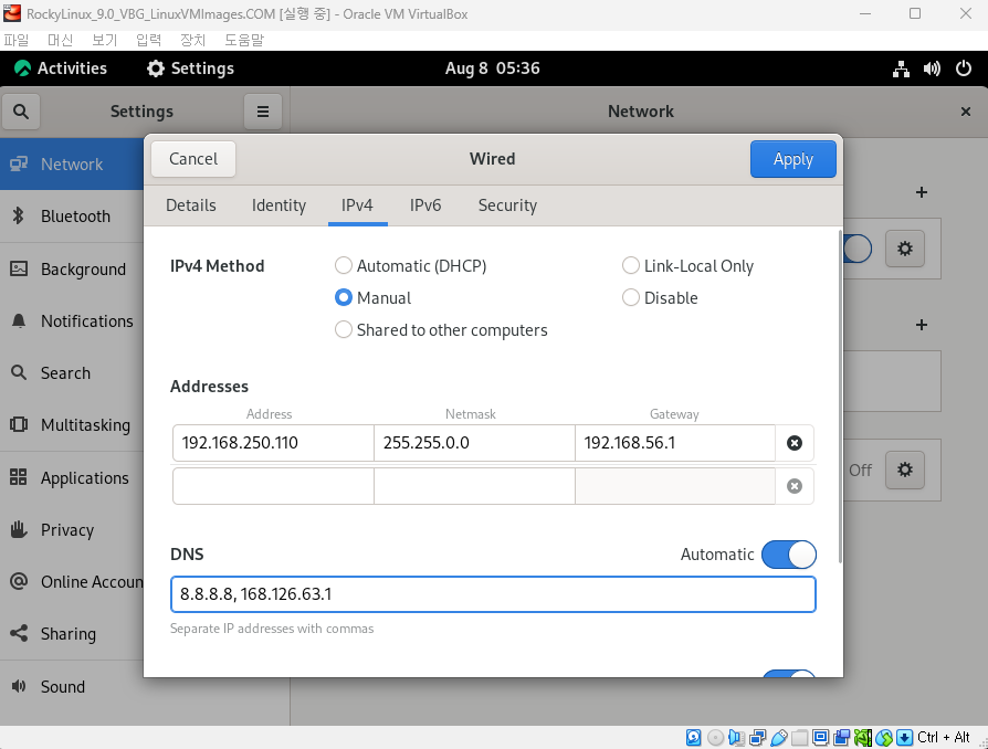 설정 > Wired Connection > 네트워크 설정 > IPv4 세부정보 입력