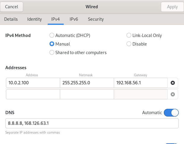 IPv4 선택 > Manual 선택 > 세부정보 입력