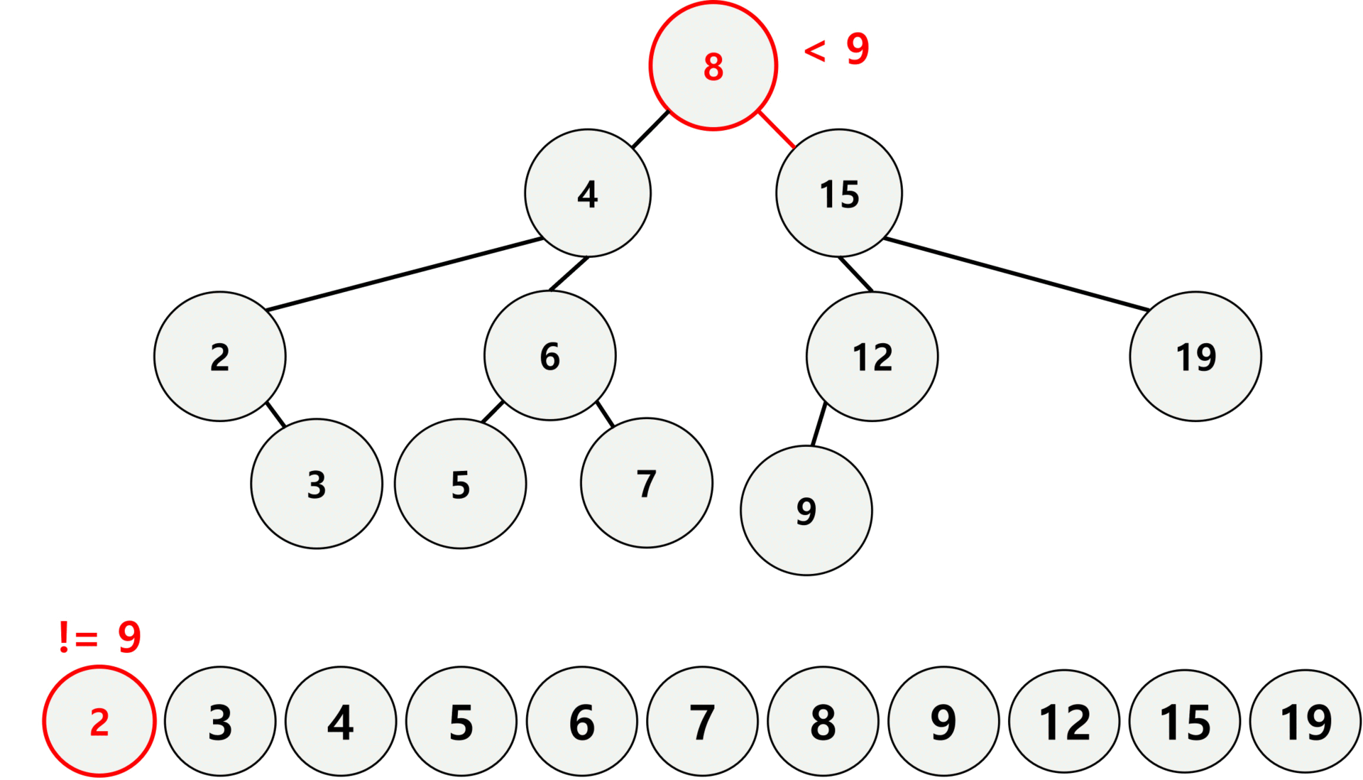 위 gif는 이진 탐색 트리와 일반 리스트에서 9를 찾는 과정이다.