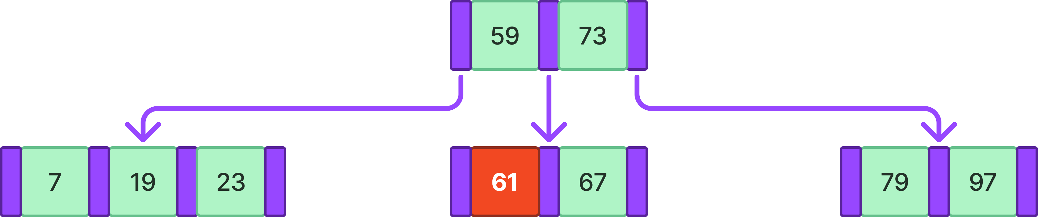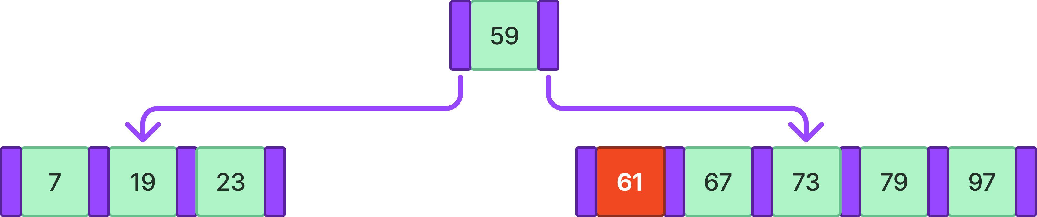 위와 같은 4차 B-tree에서 61을 삽입한다고 하자.