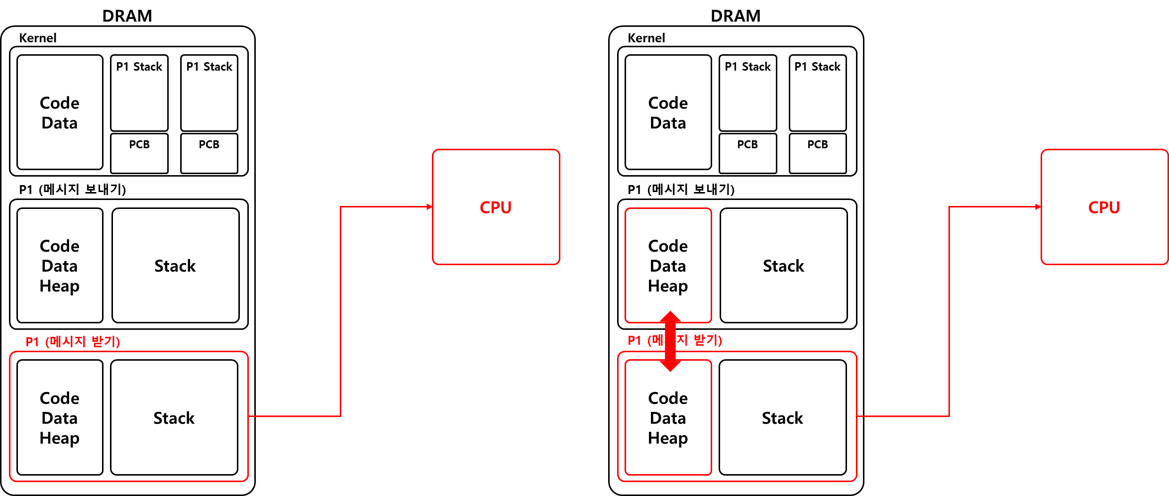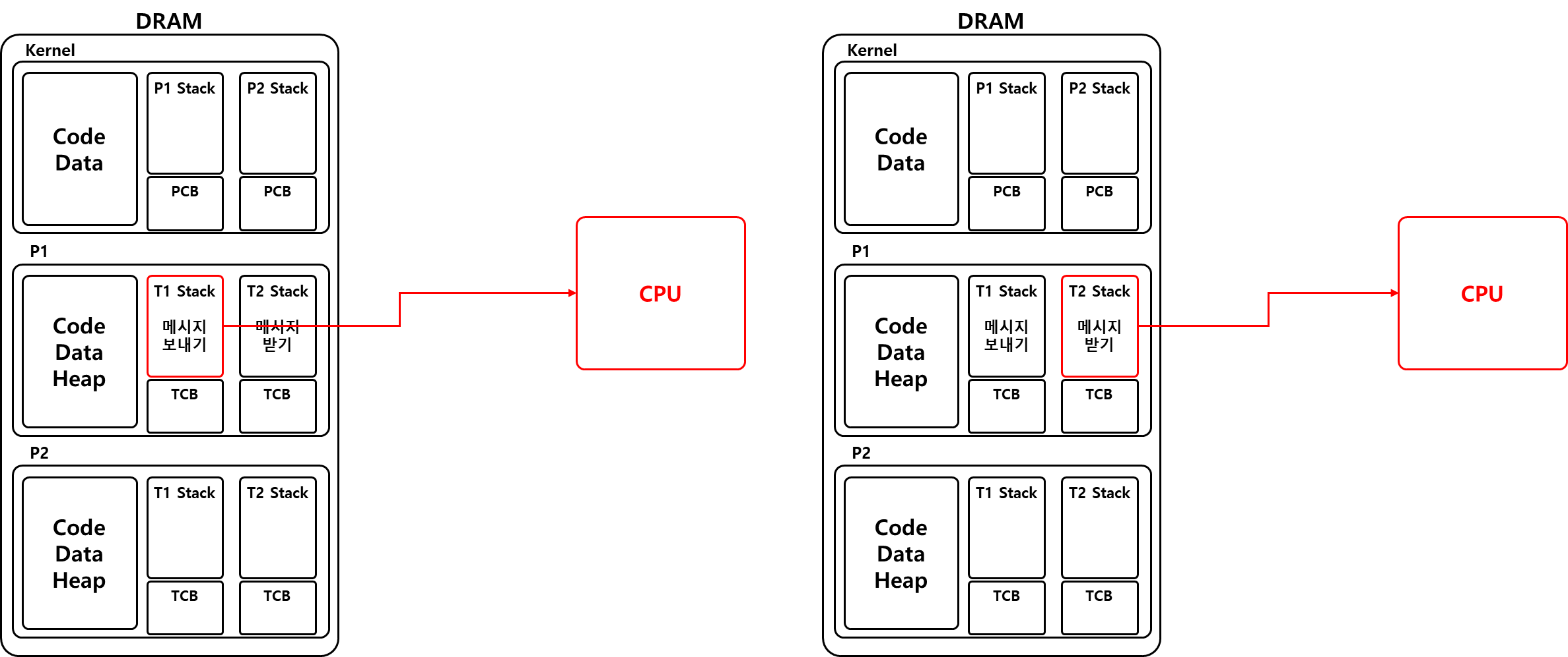 즉, 메세지를 보내는 작업을 처음부터 다시 해야한다. 이를 해결하려면 작업 단위마다 프로세스를 더 만들어야 하는데 이는 매우 비효율적이고 데이터 공유가 힘들다.