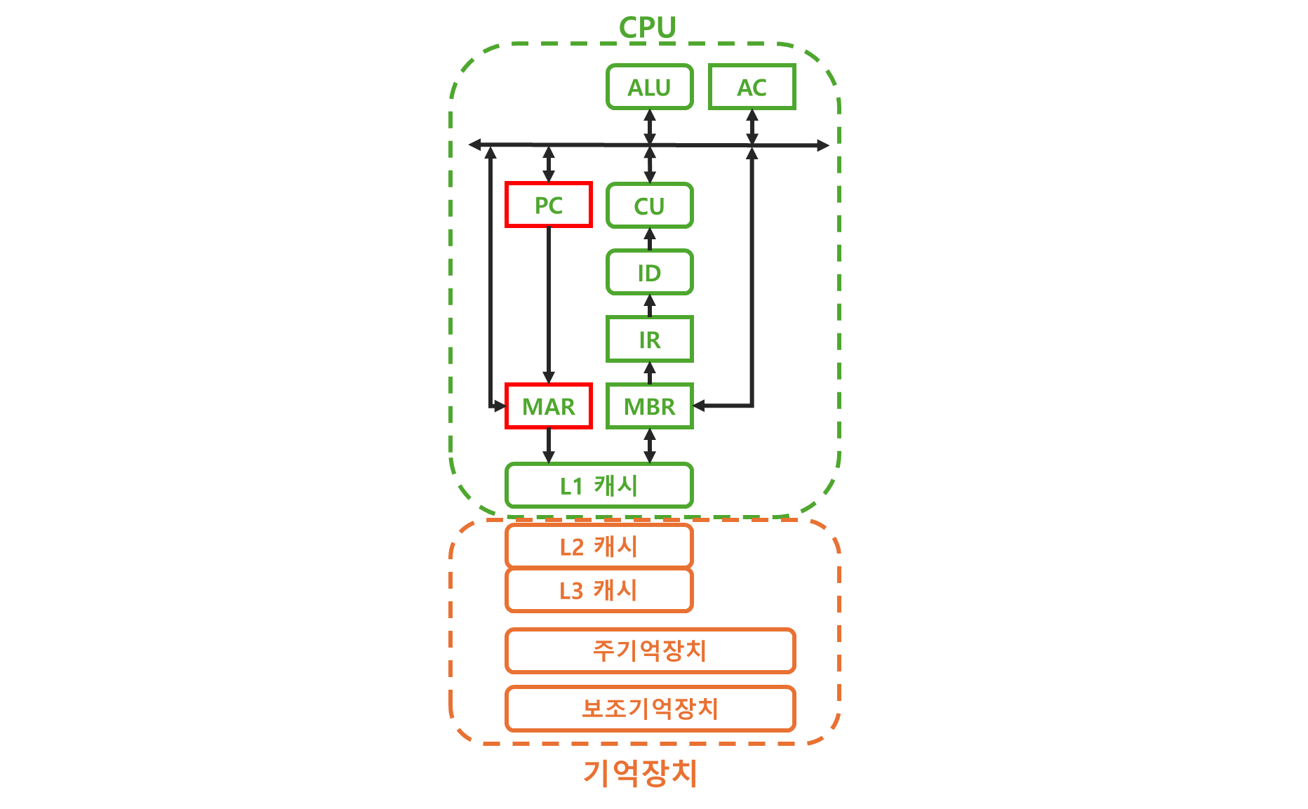 받아온 명령어는 IR, ID, CU를 통해 수행된다.