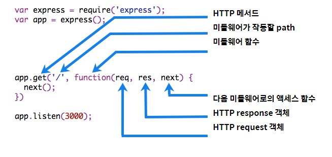 미들웨어 함수는 req(요청) 객체, res(응답) 객체, 그리고 어플리케이션 요청-응답 사이클 도중 그 다음의 미들웨어 함수에 대한 엑세스 권한을 갖는 함수다