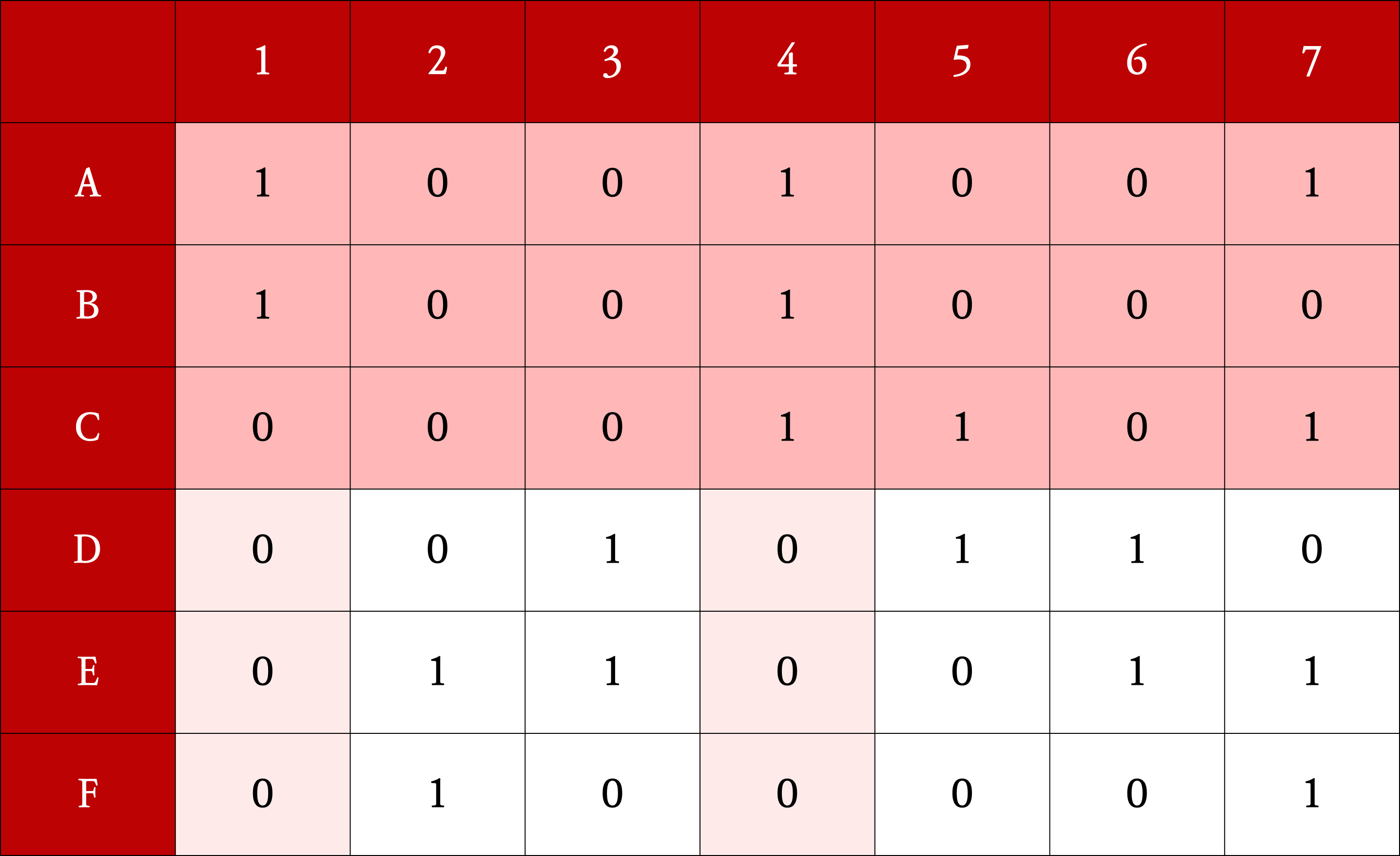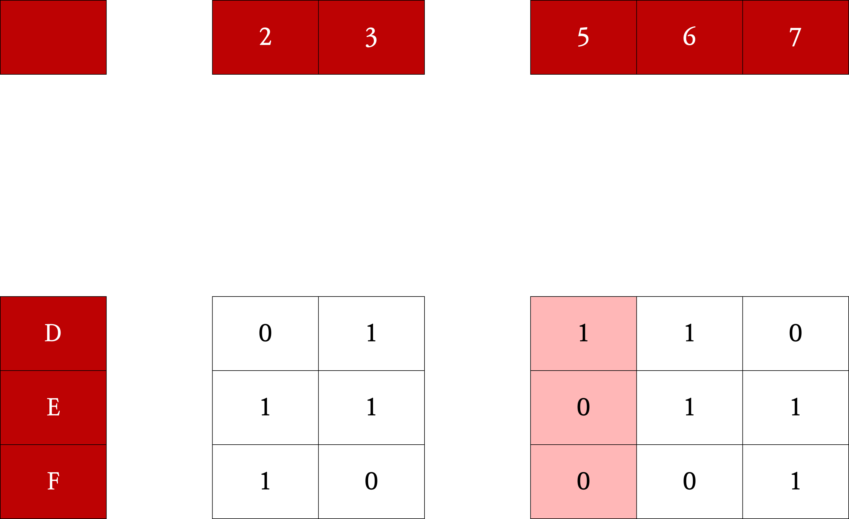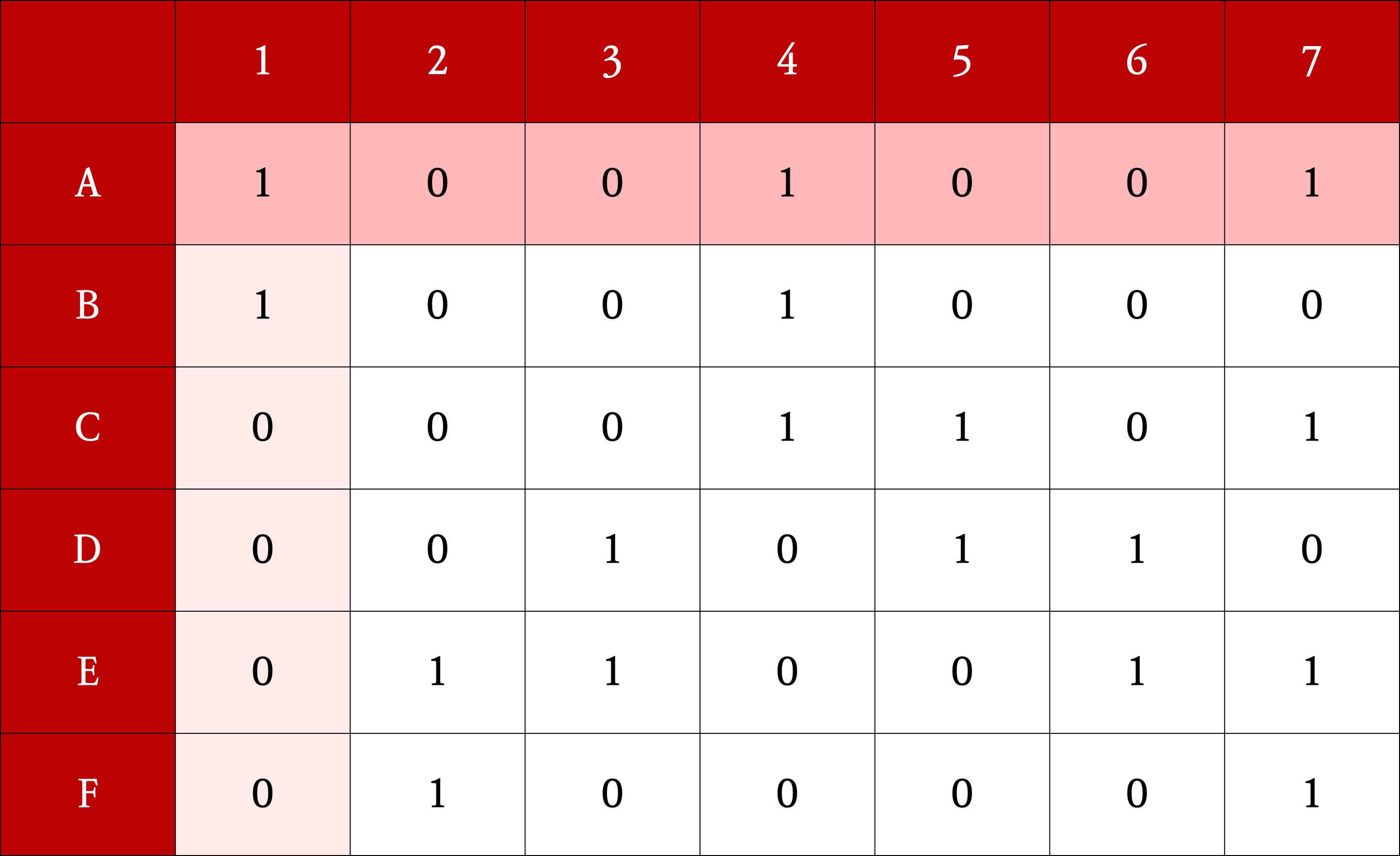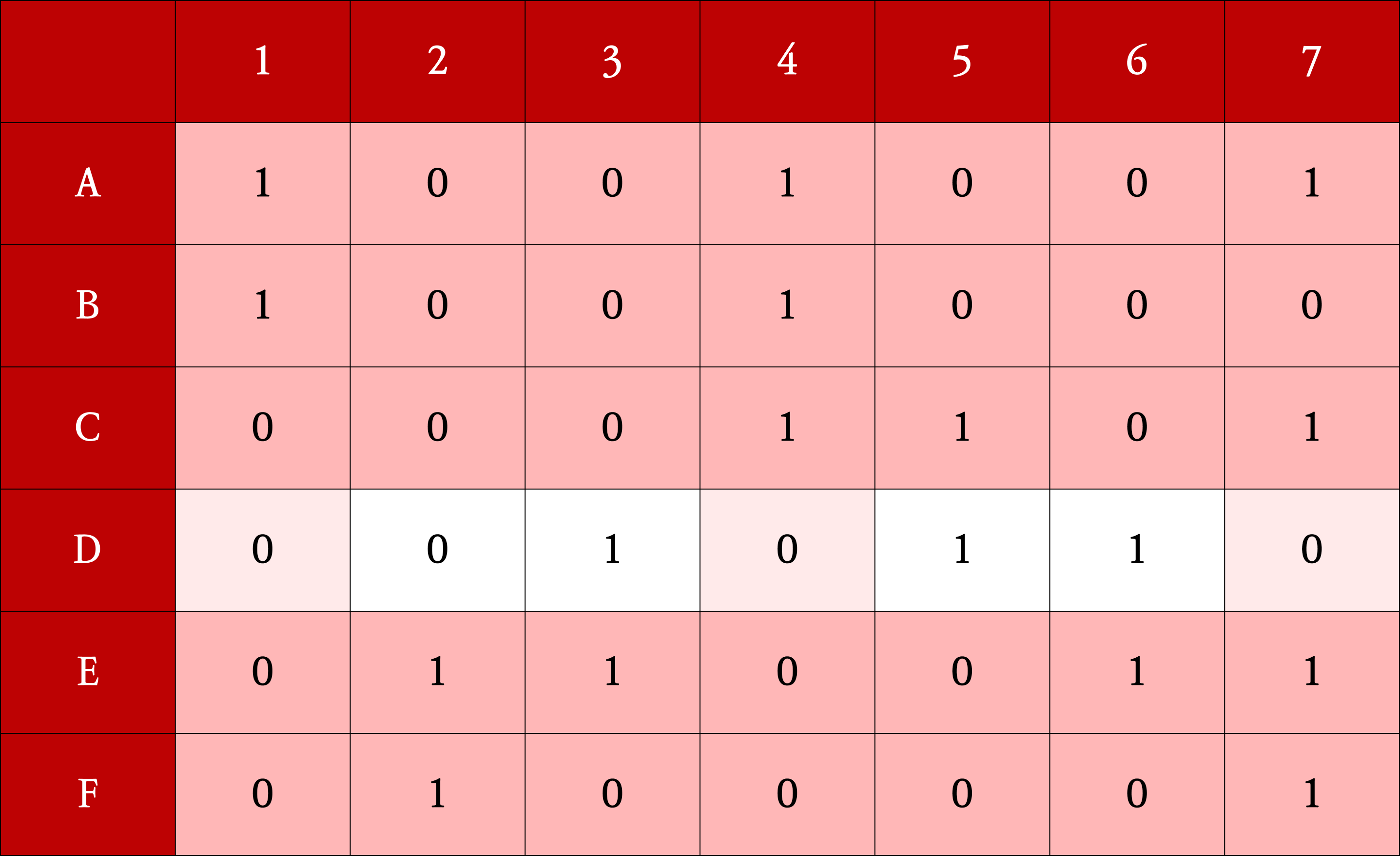 3에서 선택한 행에서 1이 속한 열을 모두 제거한다.