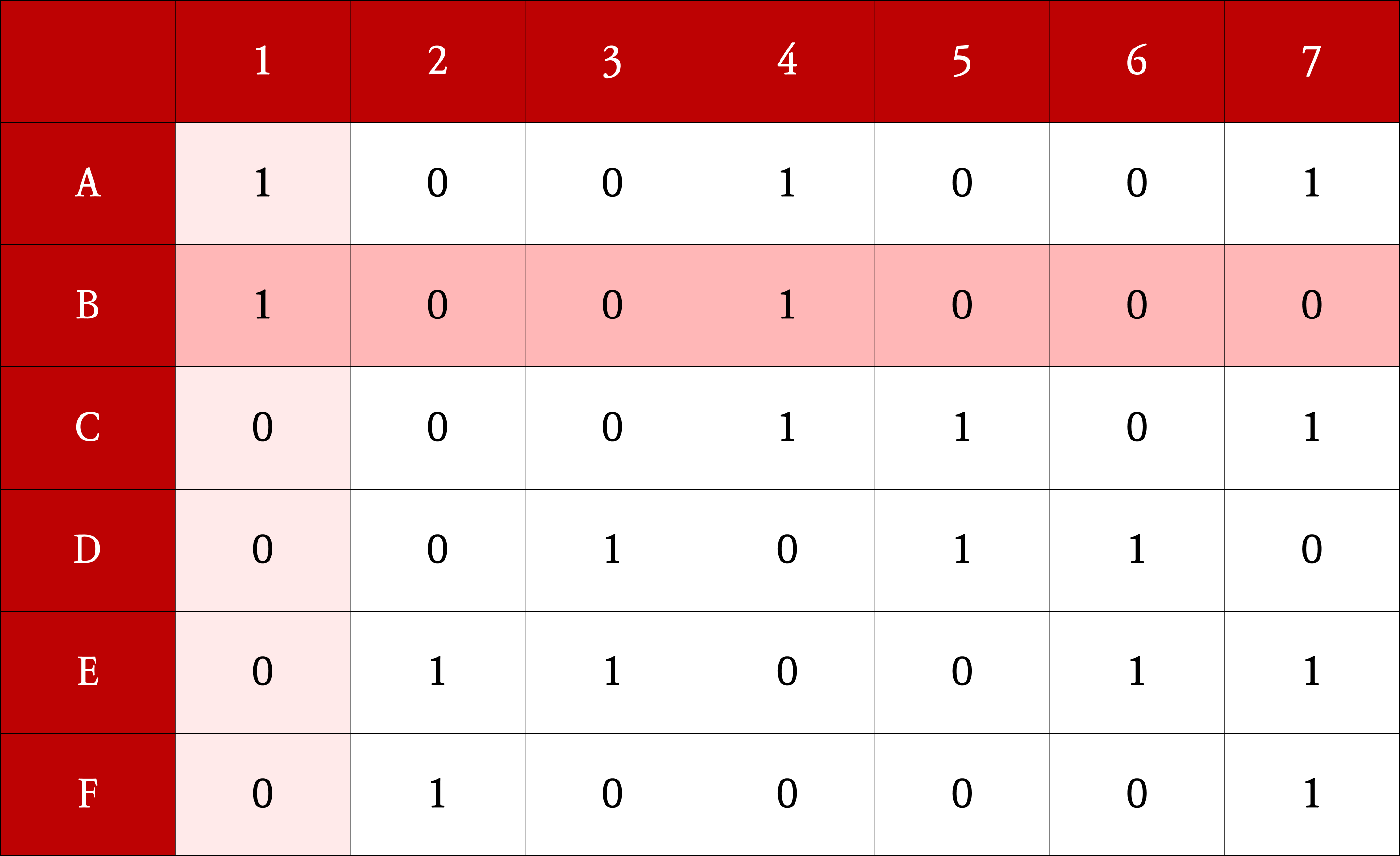 2에서 선택한 열에서 1이 있는 행을 partial solution에 포함 후 제거한다. (nondeterministically)