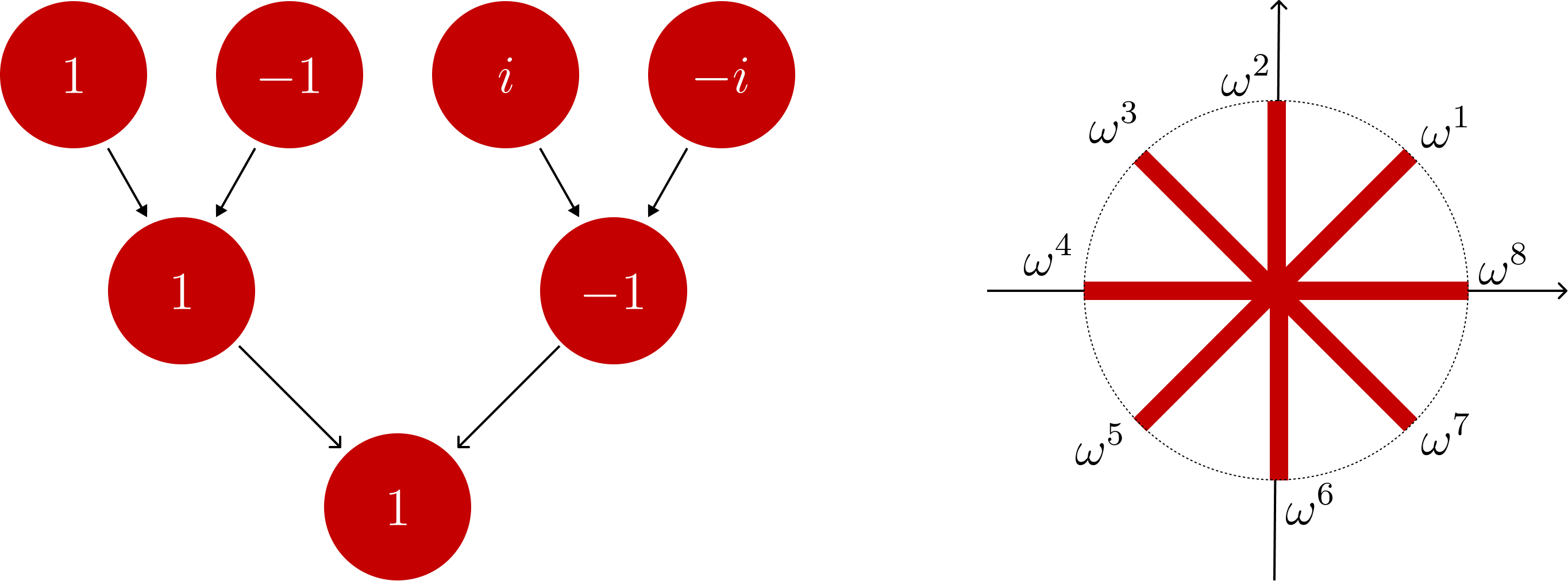 원래 FFT대로라면 x 0 , x 1 x_0,x_1 x 0 , x 1 에 { 1 , − 1 , i , − i } \{1,-1,i,-i\} { 1 , − 1 , i , − i } 를 대입하여 x 0 2 , x 1 2 x_0^2, x_1^2 x 0 2 , x 1 2 까지의 결과를 도출하겠지만, { 1 , − 1 } \{1,-1\} { 1 , − 1 } 만 대입하면 어떻게 될까요?