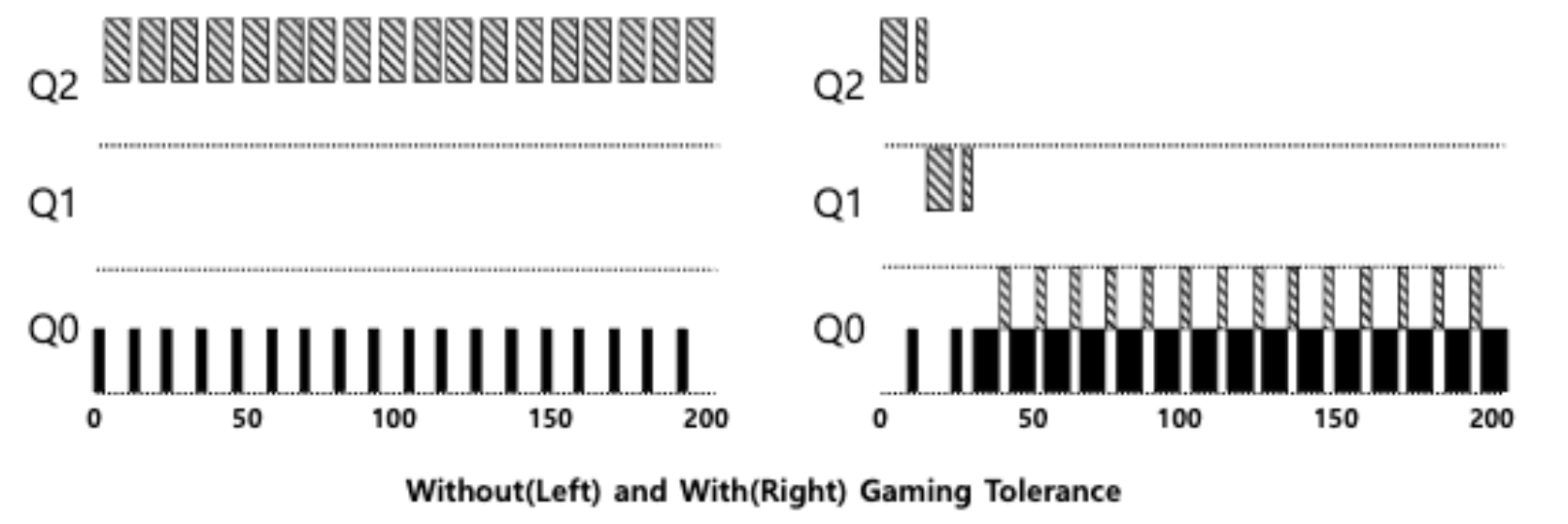 - 낮은 우선순위를 갖는 queue는 더 긴 time slice를 갖는다.