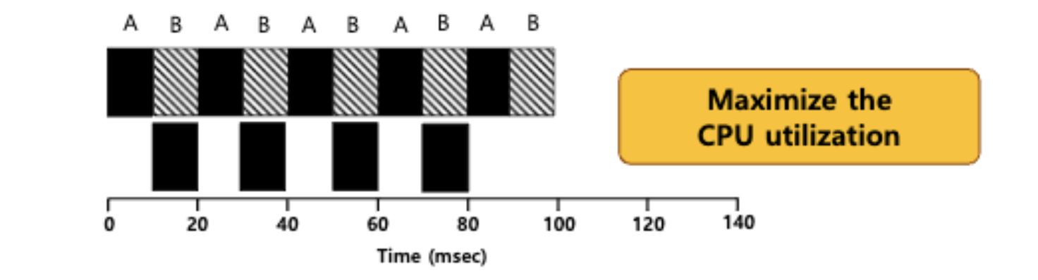 - 그러면 당연하게도 CPU가 I/O 때문에 쉬는 시간에는 다른 프로세스를 실행시켜야 할 것이다.