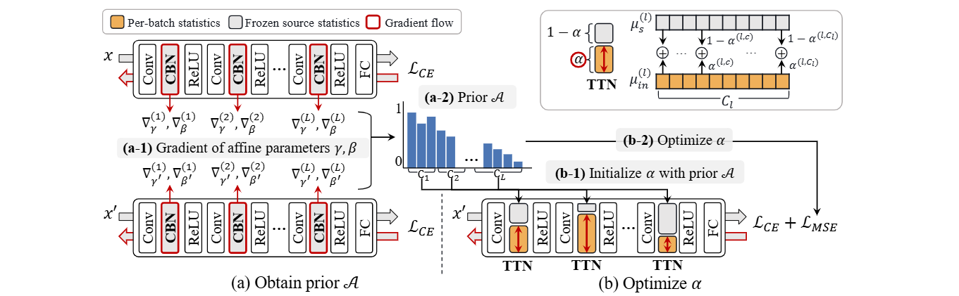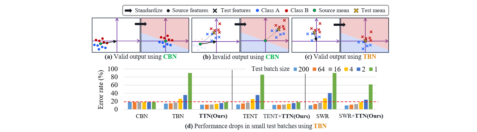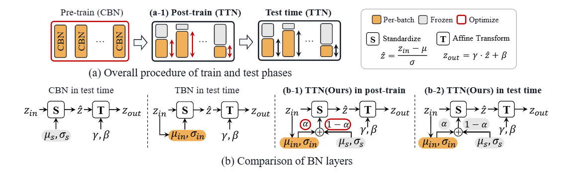 - ์ฑ๋๋ณ ๋ณด๊ฐ ๊ฐ์ค์น๋ฅผ ์ฌ์ฉํ์ฌ Source batch statistics(CBN)์ Test batch statistics(TBN)๋ฅผ ๊ฒฐํฉํ๋ฉฐ, ์๋ก์ด ๋๋ฉ์ธ์ ๋ํด ์ ์ํ๋ฉด์๋ ์์ฒ์ง์์ ๋ณด์กดํ๋ TTN ๋ ์ด์ด๋ฅผ ์ ์ํ๋ค.