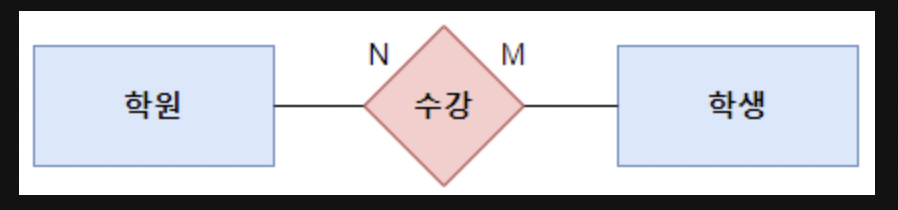 학원과 학생의 관계를 예로 들면, 한 학원에서는 여러명의 학생이 등록할 수 있으므로 1:N