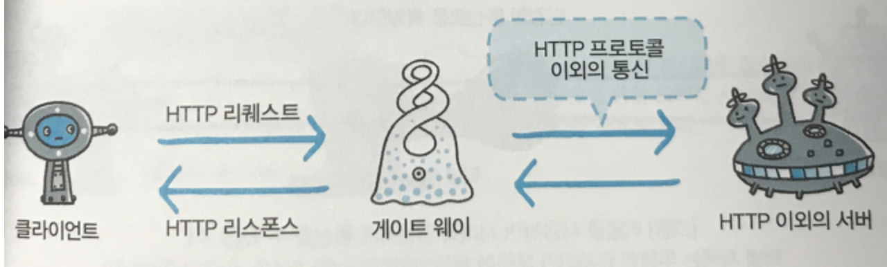 동작은 프록시와 유사하지만 게이트웨이는 그 다음에 있는 서버가 HTTP 서버 이외의 서비스를 제공하는 서버
