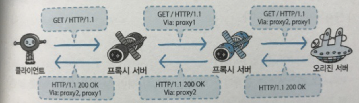 서버를 경유해서 리퀘스트와 리스폰스를 릴레이 할때마다 Via 헤더 필드에 경유한 호스트 정보를 추가해야 함