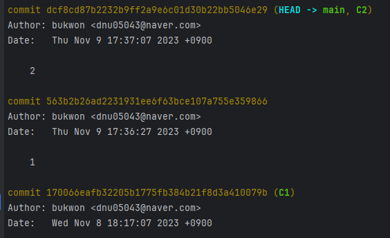 현재 나는 C1, C2(main과 같은 내용이므로 여기선 생략) 브랜치를 가지고 있고 각각의 해시 값이 존재하는 커밋이 있다.