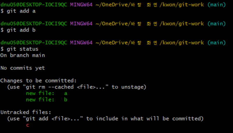 여기서 git add "파일명" 해주면 인덱스(index)에 잘 커밋된다.