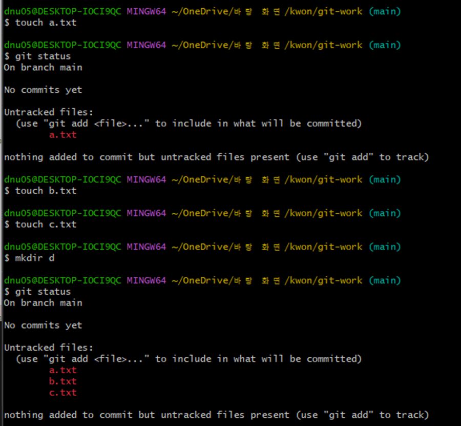 a, b, c 파일과 d 디렉터리를 만들고 git status 입력하면 아직 커밋된 파일이 없다고 뜬다.