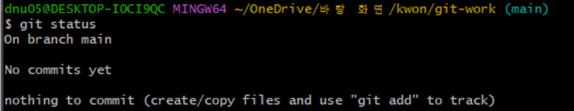 git bash에서 git status를 입력하면 아무것도 뜨지 않는 것을 확인 할 수 있다.