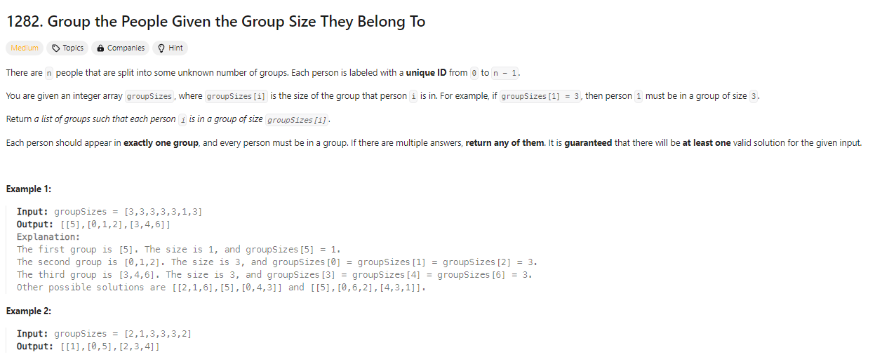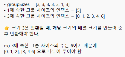 이번 문제의 핵심은 어떤 배열 groupSizes 가 주어졌을 때, 알맞은 배열에 다시 재배치하는 문제이다. 문제를 이해하면 어렵지 않지만, List를 이용한 이중 배열을 반환해야 했기에 낯설게 느껴져 List 이중 배열에 대해 검색해보며 문제를 해결했다.