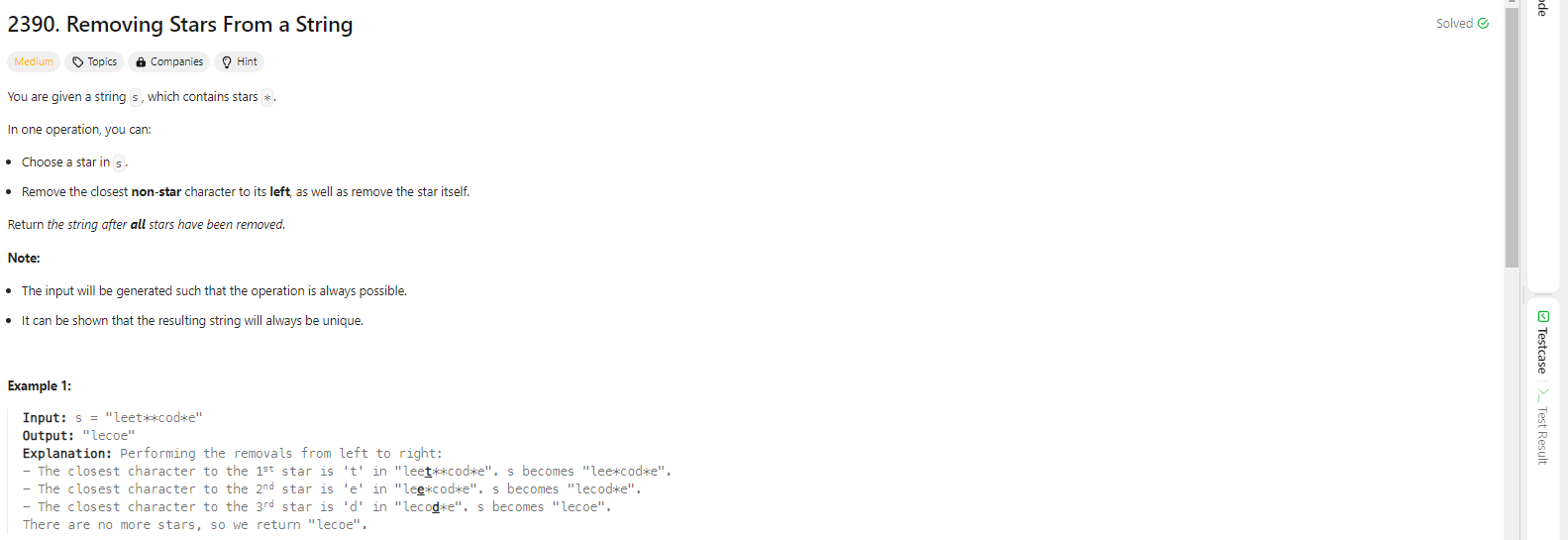 예를 들어, 'leet**code' 를 입력받으면 'lecode' 가 정답이 된다.