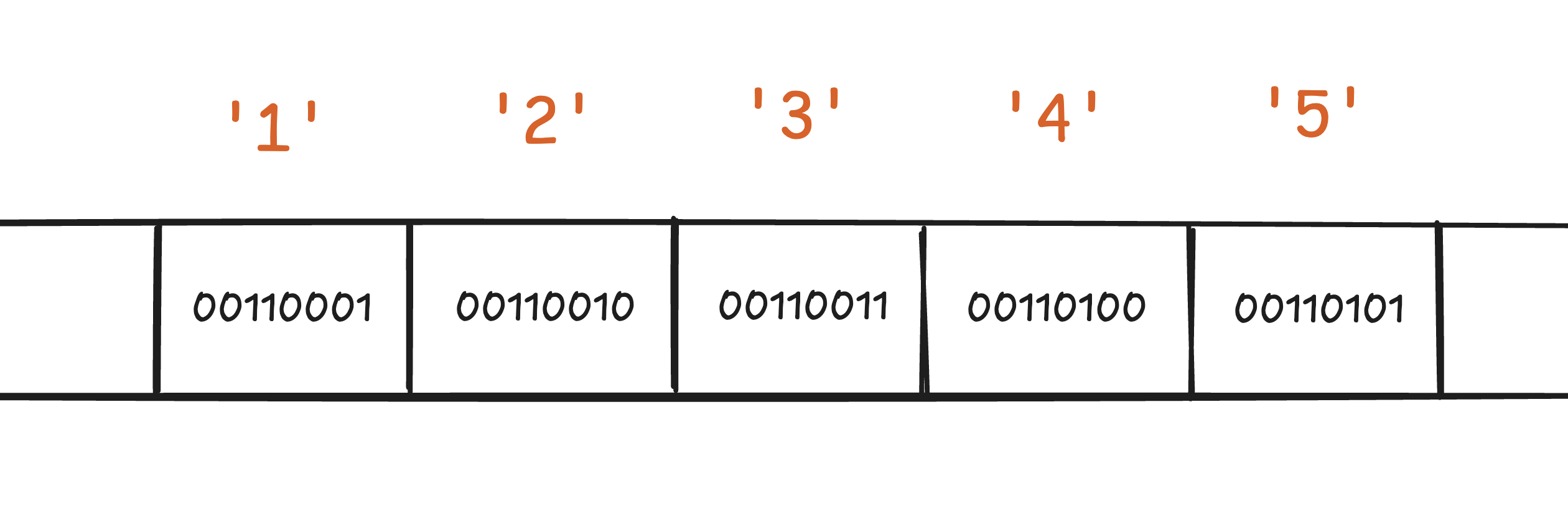 하지만 컴퓨터는 "12345"라는 문자열을 봤을 때, 이것이 수학적 의미의 1만 2천 3백 4십 5라는 것을 직관적으로 알지 못합니다. 컴퓨터 입장에서 문자열은 그저 문자들의 배열일 뿐입니다. 아래 사진과 같이 말이죠.