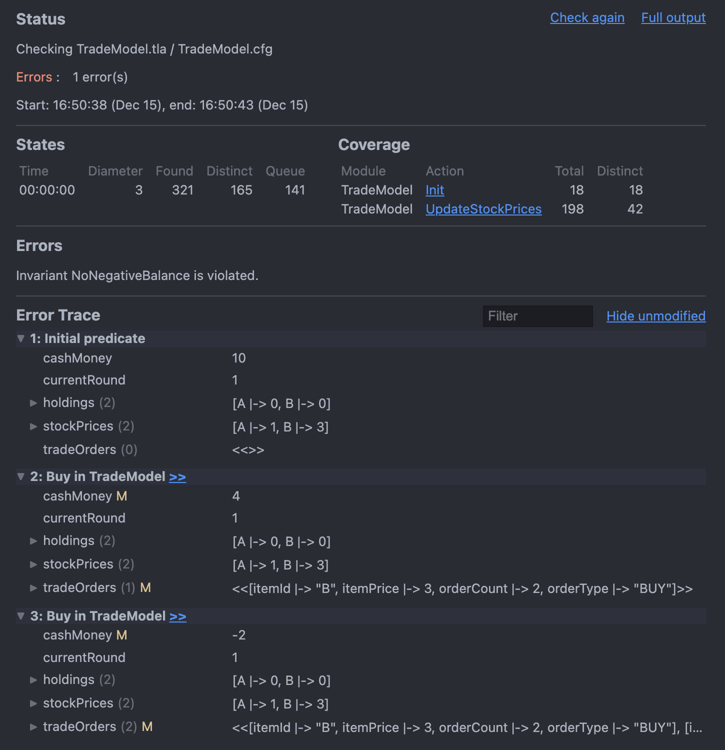 처음 모델을 돌렸을 때, NoNegativeBalance 위반 에러가 떴습니다. 확인해 보니, Buy 액션에서 잔액 체크를 하는 시점과 실제 차감하는 시점의 논리적 구멍이 있었습니다. 코드를 짜기 전에 설계 단계에서 치명적인 버그를 미리 잡아낸 것입니다.