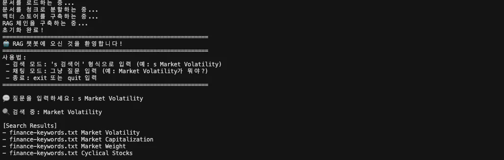 RunnableWithMessageHistory로 감싸면, 동일한 세션(session_id) 안에서는 이전 대화 내용이 자동으로 프롬프트에 포함됩니다.input_messages_key="query" : 사용자가 입력한 질문history_messages_key="history" : 저장된 대화 히스토리LLM을 붙이기 전에, 검색이 제대로 되는지 먼저 확인하는 모드입니다. 이 단계에서는 키워드를 입력하면, 관련 문서 섹션의 출처(source)와 제목(section_title)만 출력됩니다.