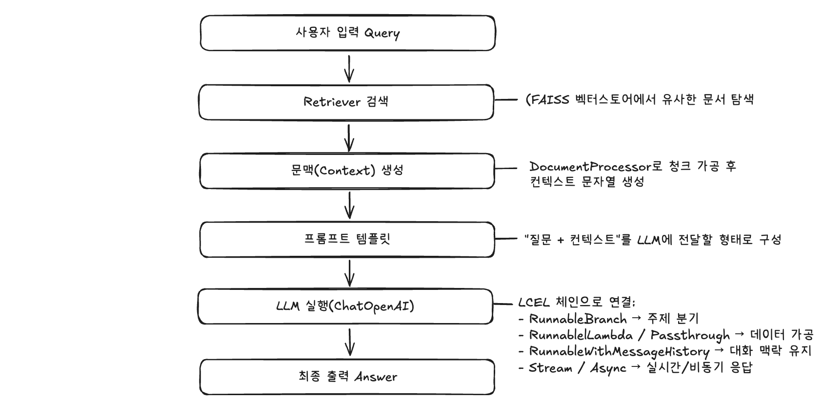 정리하면 "검색 → 답변 → 맥락 유지 → 병렬/비동기 처리라는 흐름을 하나의 파이프라인에서 확인하는 것"이 핵심 목표입니다.