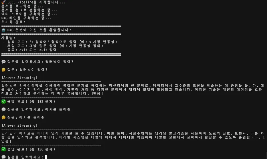 같은 세션(session_id)에서는 이전 대화를 기억합니다. 예를 들어, 먼저 "딥러닝이 뭐야?"라고 물은 뒤에 "예시를 들어줘"라고 하면 모델이 앞 대화의 맥락을 기억하고 이어서 대답합니다. 이것은 RunnableWithMessageHistory덕분에 가능한 기능입니다.