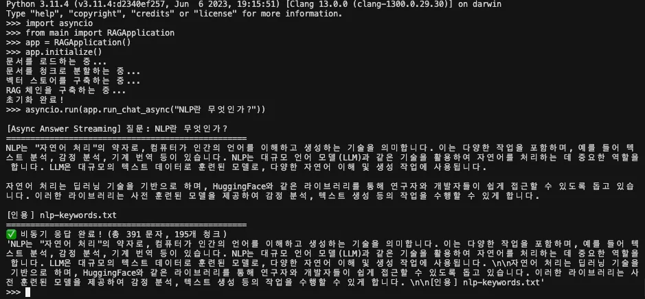 검색만 검증할 수 있는 검증 모드, 토큰 단위로 답변을 보여주는 스트리밍, 맥락을 이어가는 메모리, 여러 질문을 동시에 처리하는 배치, 서버 환경에서 유용한 비동기 처리까지 동시에 확인할 수 있었습니다.