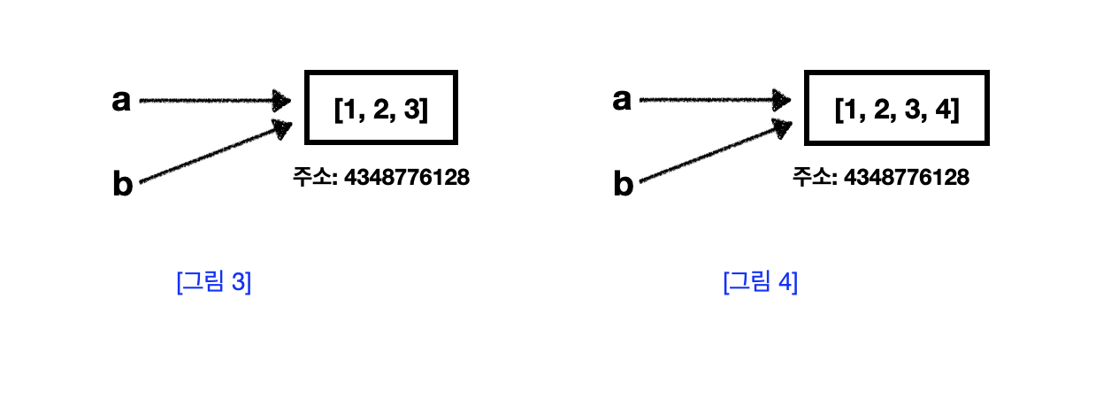 리스트는 값이 변경될 수 있는 자료형이므로 [1, 2, 3]을 담고있던 메모리의 값 자체가 [1, 2, 3, 4]로 변경된다. 주소는 당연히 그대로 유지된다.