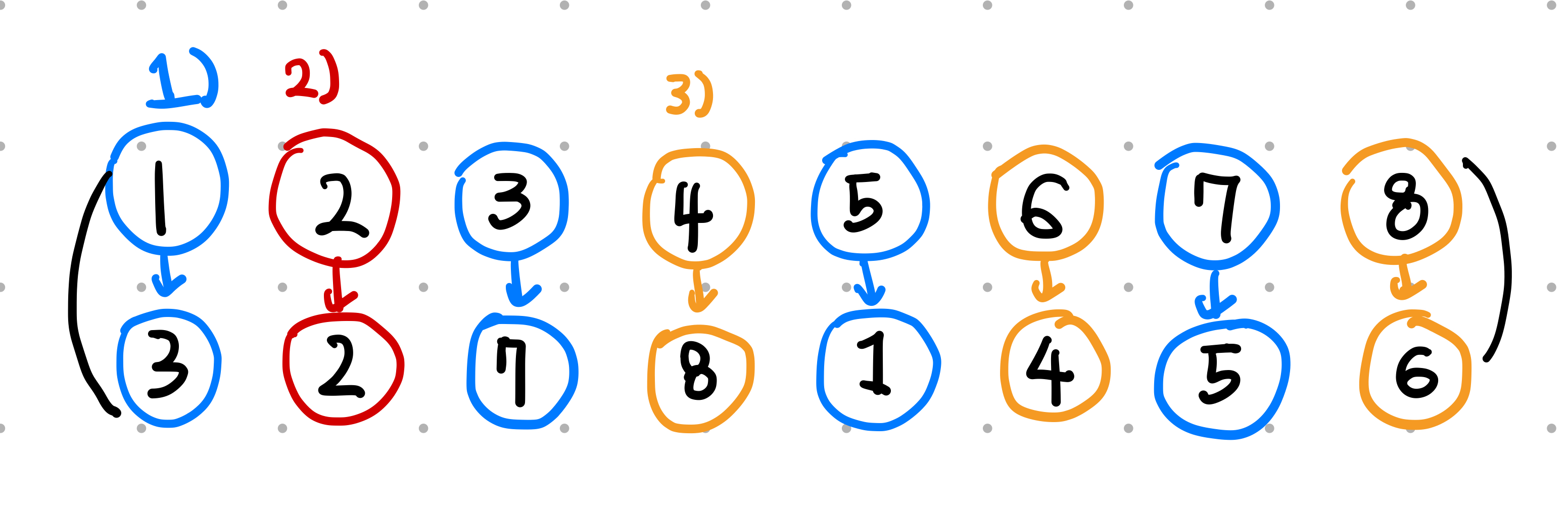 결국 1~8까지의 배열과 순열 (3, 2, 7, 8, 1, 4, 5, 6)를 하나씩 매치한 화살표가 노드와 노드의 연결을 의미합니다.