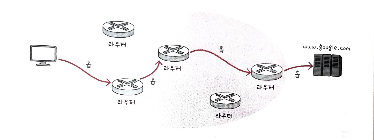 라우팅 도중 패킷이 호스트와 라우터 간에, 혹은 라우터와 라우터 간에 이동하는 하나의 과정을 홉이라고 부른다.