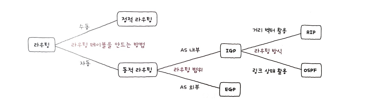 링크 상태 알고리즘 에서 각 노드는 네트워크 내 각 링크 비용을 알아야 하며, 링크 비용이 변할 때마다 새로운 링크 비용이 모든 노드에게 전달되어야 한다.거리 벡터 알고리즘 에서는 매 반복마다 직접 연결된 이웃끼리 메시지를 교환한다.링크 상태 알고리즘 에서 경로 계산은 자신의 테이블을 만들기 위한 자신의 포워딩 테이블만 계산하기 때문에 경로 계산이 분산 수행되어 어느 정도의 견고성을 제공한다.거리 벡터 알고리즘 은 잘못된 최소 비용 경로를 일부 혹은 모든 목적지에 알릴 수 있다.라우팅 테이블을 만드는 방법은 정적 라우팅, 동적 라우팅 두 가지 방법이 있다.