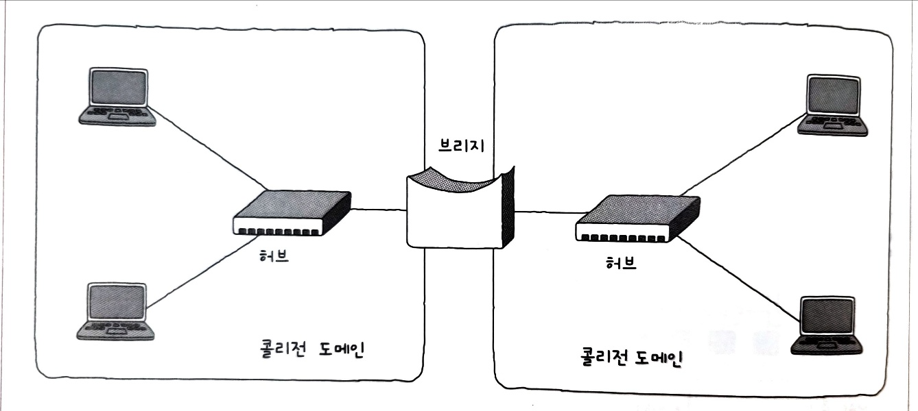 그리고 반이중 모드로 통신하므로 허브에 연결된 모든 호스트가 충돌이 발생할 범위, 즉 콜리전 도메인에 속한다.